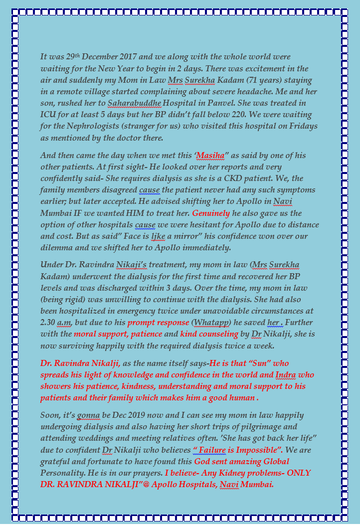 This was started with our first interaction in May 2015, with symptoms of swelling, vomiting & issues with increased Creatinine levels in blood, when I was referred by Dr. Mrs. Lad after issue with “Bales Palsy”. Dr. Ravindra had immediately attended me with detailed checkup, investigations & tests, which further concluded in the diagnosis of Chronic Kidney Failure, with further advise of Hemodialysis on regular basis.